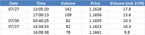Největší obchody podle objemu na EURUSD (aktivní future kontrakt):