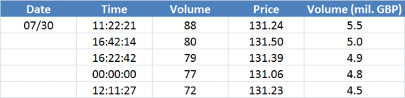 Největší obchody podle objemu na GBPUSD (aktivní future kontrakt):