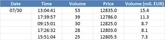 Největší obchody podle objemu na DAX (aktivní future kontrakt)