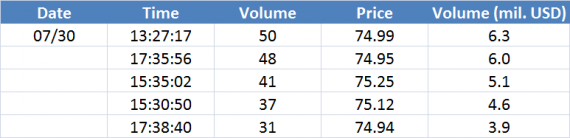 Největší obchody podle objemu na Brent (aktivní future kontrakt)