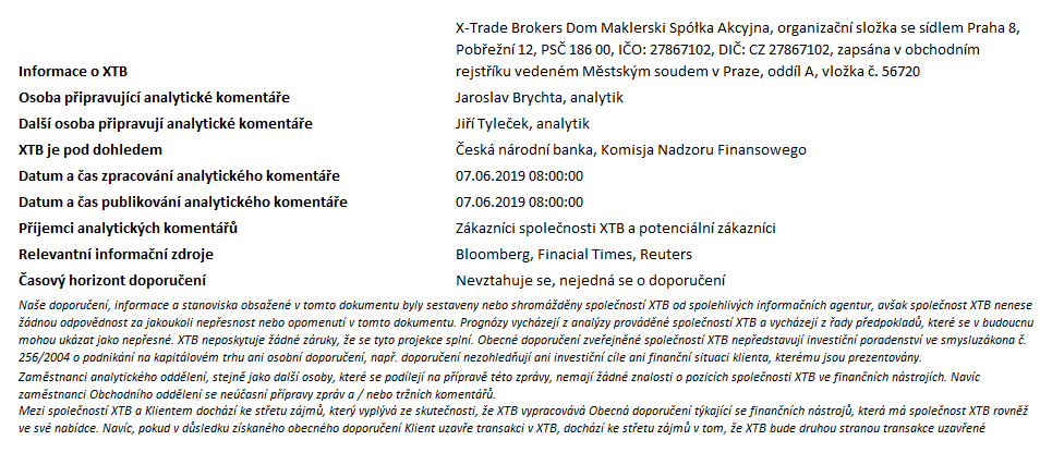 Rozdílové smlouvy jsou komplexní nástroje a v důsledku použití finanční páky jsou spojeny s vysokým rizikem rychlého vzniku finanční ztráty. U 71 % účtů retailových investorů došlo při obchodování s rozdílovými smlouvami u tohoto poskytovatele ke vzniku ztráty. Měli byste zvážit, zda rozumíte tomu, jak rozdílové smlouvy fungují, a zda si můžete dovolit vysoké riziko ztráty svých finančních prostředků. Investování je rizikové. Investujte zodpovědně. Tento materiál je marketingovou komunikací ve smyslu čl. 24 odst. 3 směrnice Evropského parlamentu a Rady 2014/65/EU ze dne 15. května 2014 o trzích finančních nástrojů, kterou se mění směrnice 2002/92/ES a směrnice 2011/61/EU (MiFID II). Marketingová komunikace není investiční doporučení ani informace doporučující či navrhující investiční strategii ve smyslu nařízení Evropského parlamentu a Rady (EU) č. 596/2014 ze dne 16. dubna 2014 o zneužívání trhu (nařízení o zneužívání trhu) a o zrušení směrnice Evropského parlamentu a Rady 2003/6/ES a směrnic Komise 2003/124/ES, 2003/125/ES a 2004/72/ES a nařízení Komise v přenesené pravomoci (EU) 2016/958 ze dne 9. března 2016, kterým se doplňuje nařízení Evropského parlamentu a Rady (EU) č. 596/2014, pokud jde o regulační technické normy pro technická ujednání pro objektivní předkládání investičních doporučení nebo jiných informací doporučujících nebo navrhujících investiční strategie a pro zveřejnění konkrétních zájmů nebo náznaků střetu zájmů nebo jakékoli jiné rady, a to i v oblasti investičního poradenství, ve smyslu zákona č. 256/2004 Sb., o podnikání na kapitálovém trhu. Marketingová komunikace je připravena s nejvyšší pečlivostí, objektivitou, prezentuje fakta známé autorovi k datu přípravy a neobsahuje žádné hodnotící prvky. Marketingová komunikace je připravena bez zohlednění potřeb klienta, jeho individuální finanční situace a nijak nepředstavuje investiční strategii. Marketingová komunikace nepředstavuje nabídku k prodeji, nabídku, předplatné, výzvu na nákup, reklamu nebo propagaci jakýchkoliv finančních nástrojů. Společnost XTB S.A., organizační složka nenese odpovědnost za jakékoli jednání nebo opomenutí klienta, zejména za získání nebo zcizení finančních nástrojů, na základě informací obsažených v této marketingové komunikaci. V případě, že marketingová komunikace obsahuje jakékoli informace o jakýchkoli výsledcích týkajících se finančních nástrojů v nich uvedených, nepředstavují žádnou záruku ani předpověď ohledně budoucích výsledků. Minulá výkonnost nemusí nutně vypovídat o budoucích výsledcích a každá osoba jednající na základě těchto informací tak činí zcela na vlastní riziko.