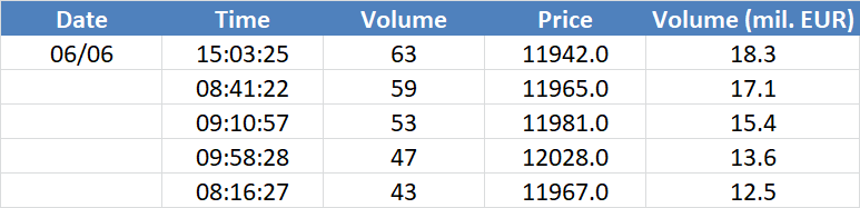 Největší obchody podle objemu na DAX  (aktivní future kontrakt)