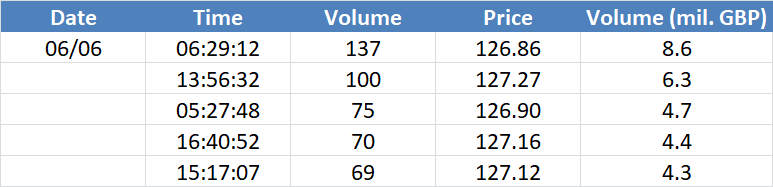 Největší obchody podle objemu na GBPUSD (aktivní future kontrakt): Největší denní objemy na trhu s měnovými futures. Na cenách, kde se včera objevily největší objemy, mohou být velcí hráči aktivní i dnes – zejména pokud se tyto ceny pohybují u některého ze včerejších high/low.