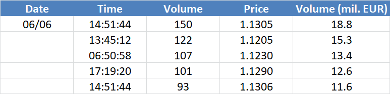 Největší obchody podle objemu na EURUSD (aktivní future kontrakt):
