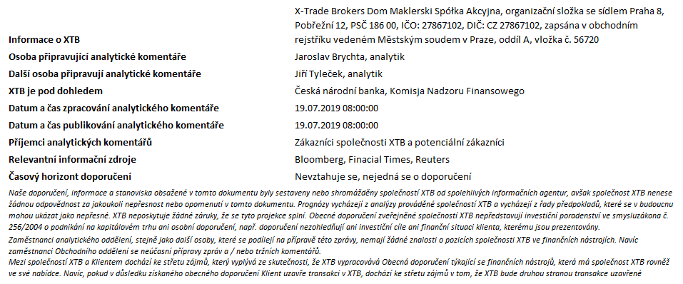Rozdílové smlouvy jsou komplexní nástroje a v důsledku použití finanční páky jsou spojeny s vysokým rizikem rychlého vzniku finanční ztráty. U 71 % účtů retailových investorů došlo při obchodování s rozdílovými smlouvami u tohoto poskytovatele ke vzniku ztráty. Měli byste zvážit, zda rozumíte tomu, jak rozdílové smlouvy fungují, a zda si můžete dovolit vysoké riziko ztráty svých finančních prostředků. Investování je rizikové. Investujte zodpovědně. Tento materiál je marketingovou komunikací ve smyslu čl. 24 odst. 3 směrnice Evropského parlamentu a Rady 2014/65/EU ze dne 15. května 2014 o trzích finančních nástrojů, kterou se mění směrnice 2002/92/ES a směrnice 2011/61/EU (MiFID II). Marketingová komunikace není investiční doporučení ani informace doporučující či navrhující investiční strategii ve smyslu nařízení Evropského parlamentu a Rady (EU) č. 596/2014 ze dne 16. dubna 2014 o zneužívání trhu (nařízení o zneužívání trhu) a o zrušení směrnice Evropského parlamentu a Rady 2003/6/ES a směrnic Komise 2003/124/ES, 2003/125/ES a 2004/72/ES a nařízení Komise v přenesené pravomoci (EU) 2016/958 ze dne 9. března 2016, kterým se doplňuje nařízení Evropského parlamentu a Rady (EU) č. 596/2014, pokud jde o regulační technické normy pro technická ujednání pro objektivní předkládání investičních doporučení nebo jiných informací doporučujících nebo navrhujících investiční strategie a pro zveřejnění konkrétních zájmů nebo náznaků střetu zájmů nebo jakékoli jiné rady, a to i v oblasti investičního poradenství, ve smyslu zákona č. 256/2004 Sb., o podnikání na kapitálovém trhu. Marketingová komunikace je připravena s nejvyšší pečlivostí, objektivitou, prezentuje fakta známé autorovi k datu přípravy a neobsahuje žádné hodnotící prvky. Marketingová komunikace je připravena bez zohlednění potřeb klienta, jeho individuální finanční situace a nijak nepředstavuje investiční strategii. Marketingová komunikace nepředstavuje nabídku k prodeji, nabídku, předplatné, výzvu na nákup, reklamu nebo propagaci jakýchkoliv finančních nástrojů. Společnost XTB S.A., organizační složka nenese odpovědnost za jakékoli jednání nebo opomenutí klienta, zejména za získání nebo zcizení finančních nástrojů, na základě informací obsažených v této marketingové komunikaci. V případě, že marketingová komunikace obsahuje jakékoli informace o jakýchkoli výsledcích týkajících se finančních nástrojů v nich uvedených, nepředstavují žádnou záruku ani předpověď ohledně budoucích výsledků. Minulá výkonnost nemusí nutně vypovídat o budoucích výsledcích a každá osoba jednající na základě těchto informací tak činí zcela na vlastní riziko.