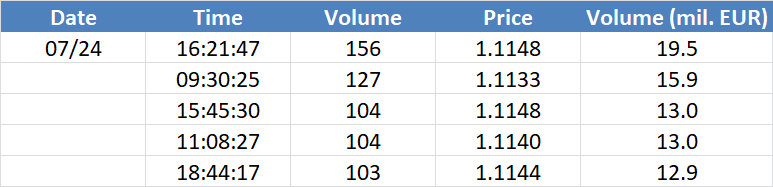 Největší obchody podle objemu na EURUSD (aktivní future kontrakt):