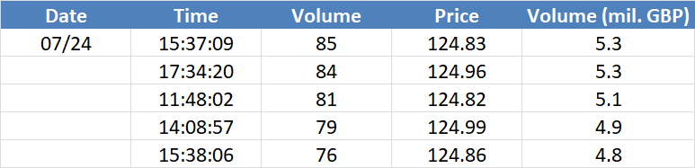 Největší obchody podle objemu na GBPUSD (aktivní future kontrakt): Největší denní objemy na trhu s měnovými futures. Na cenách, kde se včera objevily největší objemy, mohou být velcí hráči aktivní i dnes – zejména pokud se tyto ceny pohybují u některého ze včerejších high/low.