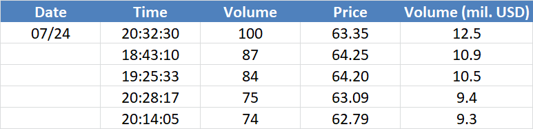 Největší obchody podle objemu na Brent (aktivní future kontrakt)