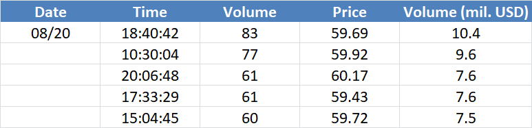Největší obchody podle objemu na Brent (aktivní future kontrakt)