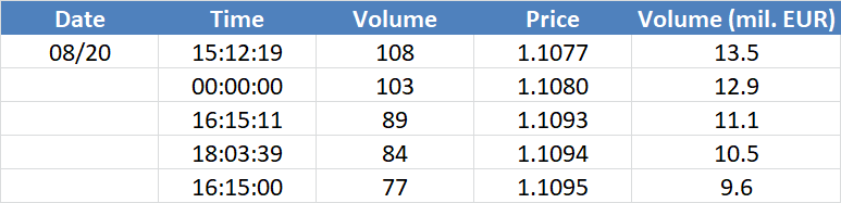 Největší obchody podle objemu na EURUSD (aktivní future kontrakt):