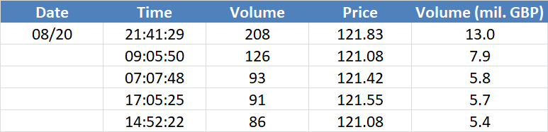 Největší obchody podle objemu na GBPUSD (aktivní future kontrakt): Největší denní objemy na trhu s měnovými futures. Na cenách, kde se včera objevily největší objemy, mohou být velcí hráči aktivní i dnes – zejména pokud se tyto ceny pohybují u některého ze včerejších high/low.