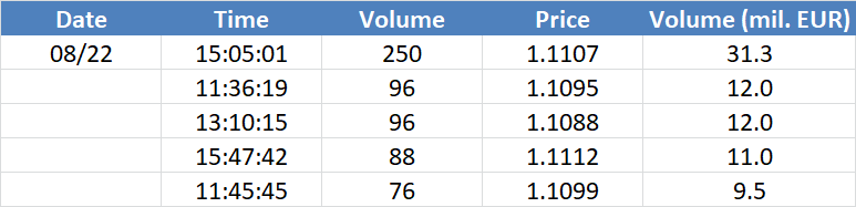 Největší obchody podle objemu na EURUSD (aktivní future kontrakt):
