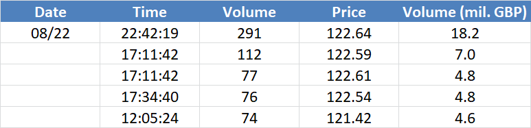 Největší obchody podle objemu na GBPUSD (aktivní future kontrakt): Největší denní objemy na trhu s měnovými futures. Na cenách, kde se včera objevily největší objemy, mohou být velcí hráči aktivní i dnes – zejména pokud se tyto ceny pohybují u některého ze včerejších high/low.