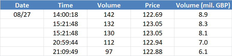 Největší obchody podle objemu na GBPUSD (aktivní future kontrakt): Největší denní objemy na trhu s měnovými futures. Na cenách, kde se včera objevily největší objemy, mohou být velcí hráči aktivní i dnes – zejména pokud se tyto ceny pohybují u některého ze včerejších high/low.