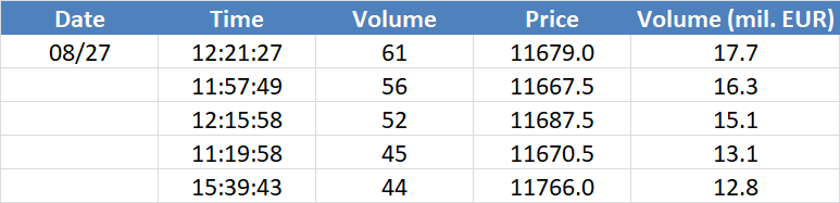 Největší obchody podle objemu na DAX (aktivní future kontrakt)