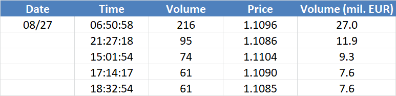 Největší obchody podle objemu na EURUSD (aktivní future kontrakt):