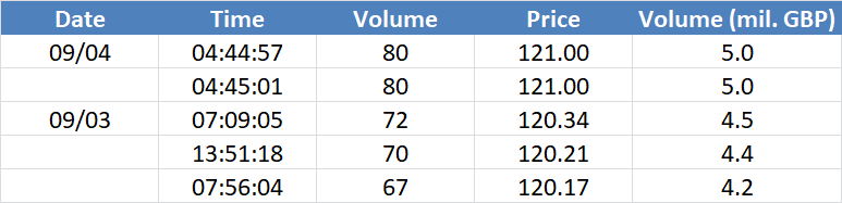 Největší obchody podle objemu na GBPUSD (aktivní future kontrakt): Největší denní objemy na trhu s měnovými futures. Na cenách, kde se včera objevily největší objemy, mohou být velcí hráči aktivní i dnes – zejména pokud se tyto ceny pohybují u některého ze včerejších high/low.