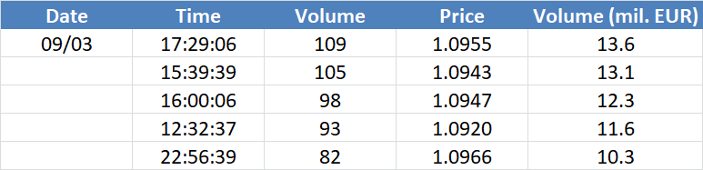 Největší obchody podle objemu na EURUSD (aktivní future kontrakt):