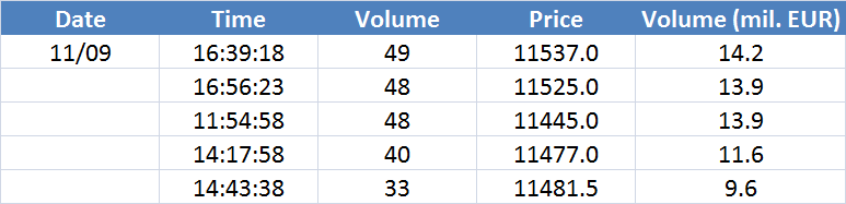 Největší obchody podle objemu na DAX (aktivní future kontrakt)