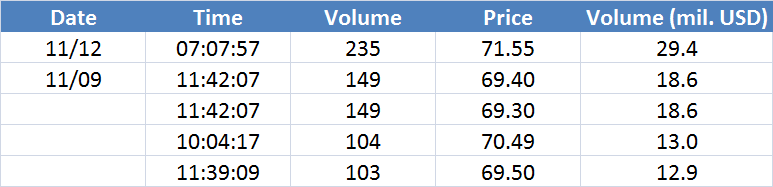 Největší obchody podle objemu na Brent (aktivní future kontrakt)