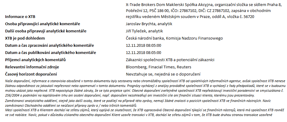 Rozdílové smlouvy jsou komplexní nástroje a v důsledku použití finanční páky jsou spojeny s vysokým rizikem rychlého vzniku finanční ztráty. U 71 % účtů retailových investorů došlo při obchodování s rozdílovými smlouvami u tohoto poskytovatele ke vzniku ztráty. Měli byste zvážit, zda rozumíte tomu, jak rozdílové smlouvy fungují, a zda si můžete dovolit vysoké riziko ztráty svých finančních prostředků. Investování je rizikové. Investujte zodpovědně. Tento materiál je marketingovou komunikací ve smyslu čl. 24 odst. 3 směrnice Evropského parlamentu a Rady 2014/65/EU ze dne 15. května 2014 o trzích finančních nástrojů, kterou se mění směrnice 2002/92/ES a směrnice 2011/61/EU (MiFID II). Marketingová komunikace není investiční doporučení ani informace doporučující či navrhující investiční strategii ve smyslu nařízení Evropského parlamentu a Rady (EU) č. 596/2014 ze dne 16. dubna 2014 o zneužívání trhu (nařízení o zneužívání trhu) a o zrušení směrnice Evropského parlamentu a Rady 2003/6/ES a směrnic Komise 2003/124/ES, 2003/125/ES a 2004/72/ES a nařízení Komise v přenesené pravomoci (EU) 2016/958 ze dne 9. března 2016, kterým se doplňuje nařízení Evropského parlamentu a Rady (EU) č. 596/2014, pokud jde o regulační technické normy pro technická ujednání pro objektivní předkládání investičních doporučení nebo jiných informací doporučujících nebo navrhujících investiční strategie a pro zveřejnění konkrétních zájmů nebo náznaků střetu zájmů nebo jakékoli jiné rady, a to i v oblasti investičního poradenství, ve smyslu zákona č. 256/2004 Sb., o podnikání na kapitálovém trhu. Marketingová komunikace je připravena s nejvyšší pečlivostí, objektivitou, prezentuje fakta známé autorovi k datu přípravy a neobsahuje žádné hodnotící prvky. Marketingová komunikace je připravena bez zohlednění potřeb klienta, jeho individuální finanční situace a nijak nepředstavuje investiční strategii. Marketingová komunikace nepředstavuje nabídku k prodeji, nabídku, předplatné, výzvu na nákup, reklamu nebo propagaci jakýchkoliv finančních nástrojů. Společnost XTB S.A., organizační složka nenese odpovědnost za jakékoli jednání nebo opomenutí klienta, zejména za získání nebo zcizení finančních nástrojů, na základě informací obsažených v této marketingové komunikaci. V případě, že marketingová komunikace obsahuje jakékoli informace o jakýchkoli výsledcích týkajících se finančních nástrojů v nich uvedených, nepředstavují žádnou záruku ani předpověď ohledně budoucích výsledků. Minulá výkonnost nemusí nutně vypovídat o budoucích výsledcích a každá osoba jednající na základě těchto informací tak činí zcela na vlastní riziko.