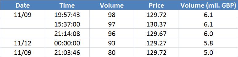 Největší obchody podle objemu na GBPUSD (aktivní future kontrakt):