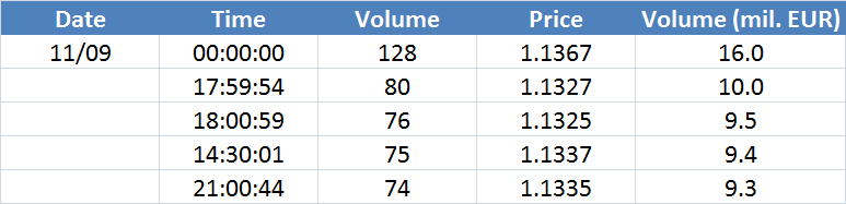 Největší obchody podle objemu na EURUSD (aktivní future kontrakt):