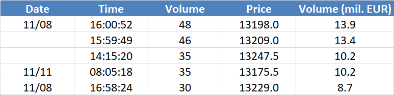 Největší obchody podle objemu na DAX (aktivní future kontrakt)
