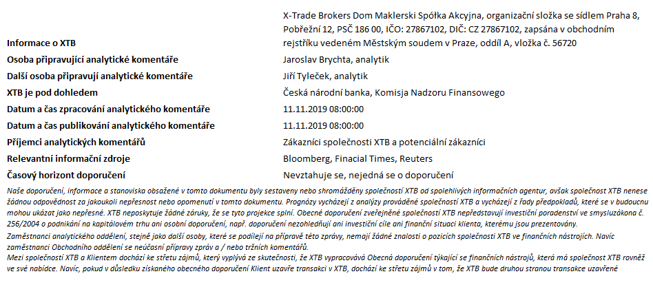 Rozdílové smlouvy jsou komplexní nástroje a v důsledku použití finanční páky jsou spojeny s vysokým rizikem rychlého vzniku finanční ztráty. U 75 % účtů retailových investorů došlo při obchodování s rozdílovými smlouvami u tohoto poskytovatele ke vzniku ztráty. Měli byste zvážit, zda rozumíte tomu, jak rozdílové smlouvy fungují, a zda si můžete dovolit vysoké riziko ztráty svých finančních prostředků. Investování je rizikové. Investujte zodpovědně. Tento materiál je marketingovou komunikací ve smyslu čl. 24 odst. 3 směrnice Evropského parlamentu a Rady 2014/65/EU ze dne 15. května 2014 o trzích finančních nástrojů, kterou se mění směrnice 2002/92/ES a směrnice 2011/61/EU (MiFID II). Marketingová komunikace není investiční doporučení ani informace doporučující či navrhující investiční strategii ve smyslu nařízení Evropského parlamentu a Rady (EU) č. 596/2014 ze dne 16. dubna 2014 o zneužívání trhu (nařízení o zneužívání trhu) a o zrušení směrnice Evropského parlamentu a Rady 2003/6/ES a směrnic Komise 2003/124/ES, 2003/125/ES a 2004/72/ES a nařízení Komise v přenesené pravomoci (EU) 2016/958 ze dne 9. března 2016, kterým se doplňuje nařízení Evropského parlamentu a Rady (EU) č. 596/2014, pokud jde o regulační technické normy pro technická ujednání pro objektivní předkládání investičních doporučení nebo jiných informací doporučujících nebo navrhujících investiční strategie a pro zveřejnění konkrétních zájmů nebo náznaků střetu zájmů nebo jakékoli jiné rady, a to i v oblasti investičního poradenství, ve smyslu zákona č. 256/2004 Sb., o podnikání na kapitálovém trhu. Marketingová komunikace je připravena s nejvyšší pečlivostí, objektivitou, prezentuje fakta známé autorovi k datu přípravy a neobsahuje žádné hodnotící prvky. Marketingová komunikace je připravena bez zohlednění potřeb klienta, jeho individuální finanční situace a nijak nepředstavuje investiční strategii. Marketingová komunikace nepředstavuje nabídku k prodeji, nabídku, předplatné, výzvu na nákup, reklamu nebo propagaci jakýchkoliv finančních nástrojů. Společnost XTB S.A., organizační složka nenese odpovědnost za jakékoli jednání nebo opomenutí klienta, zejména za získání nebo zcizení finančních nástrojů, na základě informací obsažených v této marketingové komunikaci. V případě, že marketingová komunikace obsahuje jakékoli informace o jakýchkoli výsledcích týkajících se finančních nástrojů v nich uvedených, nepředstavují žádnou záruku ani předpověď ohledně budoucích výsledků. Minulá výkonnost nemusí nutně vypovídat o budoucích výsledcích a každá osoba jednající na základě těchto informací tak činí zcela na vlastní riziko.