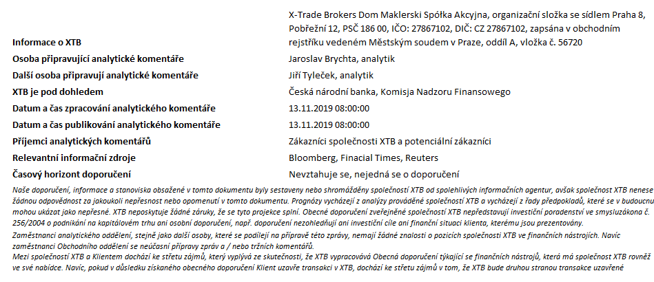 Rozdílové smlouvy jsou komplexní nástroje a v důsledku použití finanční páky jsou spojeny s vysokým rizikem rychlého vzniku finanční ztráty. U 75 % účtů retailových investorů došlo při obchodování s rozdílovými smlouvami u tohoto poskytovatele ke vzniku ztráty. Měli byste zvážit, zda rozumíte tomu, jak rozdílové smlouvy fungují, a zda si můžete dovolit vysoké riziko ztráty svých finančních prostředků. Investování je rizikové. Investujte zodpovědně. Tento materiál je marketingovou komunikací ve smyslu čl. 24 odst. 3 směrnice Evropského parlamentu a Rady 2014/65/EU ze dne 15. května 2014 o trzích finančních nástrojů, kterou se mění směrnice 2002/92/ES a směrnice 2011/61/EU (MiFID II). Marketingová komunikace není investiční doporučení ani informace doporučující či navrhující investiční strategii ve smyslu nařízení Evropského parlamentu a Rady (EU) č. 596/2014 ze dne 16. dubna 2014 o zneužívání trhu (nařízení o zneužívání trhu) a o zrušení směrnice Evropského parlamentu a Rady 2003/6/ES a směrnic Komise 2003/124/ES, 2003/125/ES a 2004/72/ES a nařízení Komise v přenesené pravomoci (EU) 2016/958 ze dne 9. března 2016, kterým se doplňuje nařízení Evropského parlamentu a Rady (EU) č. 596/2014, pokud jde o regulační technické normy pro technická ujednání pro objektivní předkládání investičních doporučení nebo jiných informací doporučujících nebo navrhujících investiční strategie a pro zveřejnění konkrétních zájmů nebo náznaků střetu zájmů nebo jakékoli jiné rady, a to i v oblasti investičního poradenství, ve smyslu zákona č. 256/2004 Sb., o podnikání na kapitálovém trhu. Marketingová komunikace je připravena s nejvyšší pečlivostí, objektivitou, prezentuje fakta známé autorovi k datu přípravy a neobsahuje žádné hodnotící prvky. Marketingová komunikace je připravena bez zohlednění potřeb klienta, jeho individuální finanční situace a nijak nepředstavuje investiční strategii. Marketingová komunikace nepředstavuje nabídku k prodeji, nabídku, předplatné, výzvu na nákup, reklamu nebo propagaci jakýchkoliv finančních nástrojů. Společnost XTB S.A., organizační složka nenese odpovědnost za jakékoli jednání nebo opomenutí klienta, zejména za získání nebo zcizení finančních nástrojů, na základě informací obsažených v této marketingové komunikaci. V případě, že marketingová komunikace obsahuje jakékoli informace o jakýchkoli výsledcích týkajících se finančních nástrojů v nich uvedených, nepředstavují žádnou záruku ani předpověď ohledně budoucích výsledků. Minulá výkonnost nemusí nutně vypovídat o budoucích výsledcích a každá osoba jednající na základě těchto informací tak činí zcela na vlastní riziko.