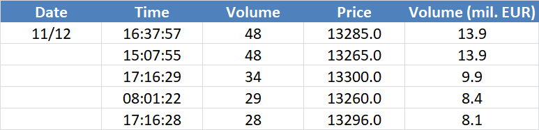Největší obchody podle objemu na DAX (aktivní future kontrakt)