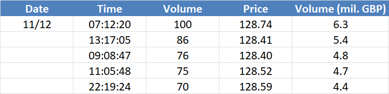 Největší obchody podle objemu na GBPUSD (aktivní future kontrakt): Největší denní objemy na trhu s měnovými futures. Na cenách, kde se včera objevily největší objemy, mohou být velcí hráči aktivní i dnes – zejména pokud se tyto ceny pohybují u některého ze včerejších high/low.