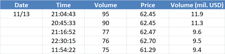 Největší obchody podle objemu na Brent (aktivní future kontrakt)