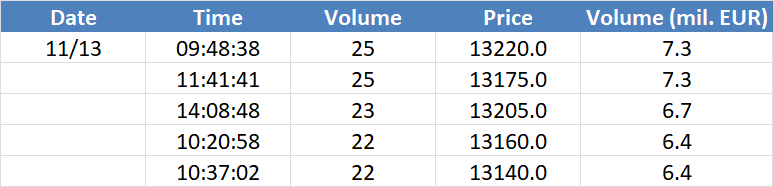 Největší obchody podle objemu na DAX (aktivní future kontrakt)