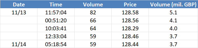 Největší obchody podle objemu na GBPUSD (aktivní future kontrakt): Největší denní objemy na trhu s měnovými futures. Na cenách, kde se včera objevily největší objemy, mohou být velcí hráči aktivní i dnes – zejména pokud se tyto ceny pohybují u některého ze včerejších high/low.