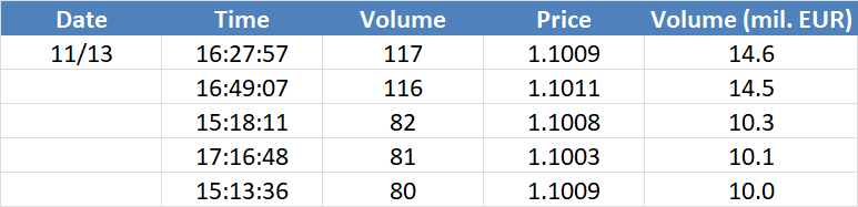 Největší obchody podle objemu na EURUSD (aktivní future kontrakt):