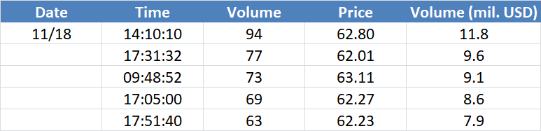 Největší obchody podle objemu na Brent (aktivní future kontrakt)