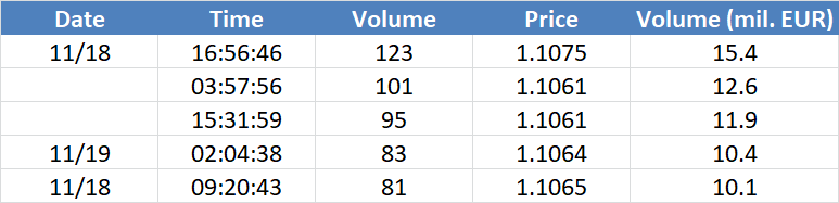 Největší obchody podle objemu na EURUSD (aktivní future kontrakt):