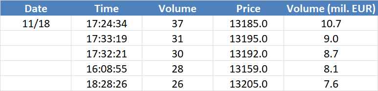 Největší obchody podle objemu na DAX (aktivní future kontrakt)