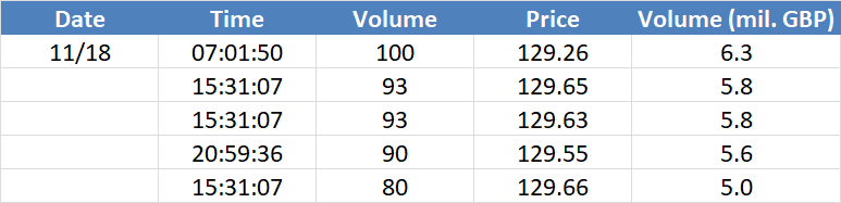Největší obchody podle objemu na GBPUSD (aktivní future kontrakt): Největší denní objemy na trhu s měnovými futures. Na cenách, kde se včera objevily největší objemy, mohou být velcí hráči aktivní i dnes – zejména pokud se tyto ceny pohybují u některého ze včerejších high/low.
