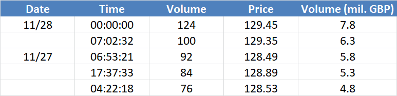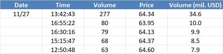 Největší obchody podle objemu na Brent (aktivní future kontrakt)