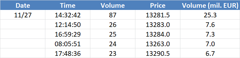 Největší obchody podle objemu na DAX (aktivní future kontrakt)