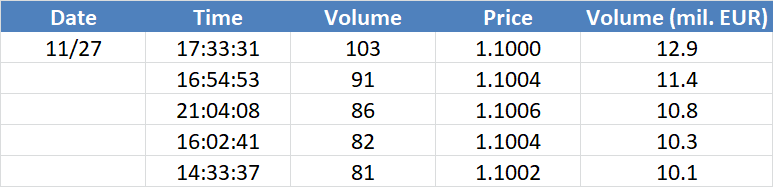 Největší obchody podle objemu na EURUSD (aktivní future kontrakt):