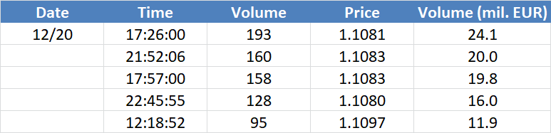 Největší obchody podle objemu na EURUSD (aktivní future kontrakt):