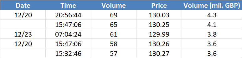Největší obchody podle objemu na GBPUSD (aktivní future kontrakt): Největší denní objemy na trhu s měnovými futures. Na cenách, kde se včera objevily největší objemy, mohou být velcí hráči aktivní i dnes – zejména pokud se tyto ceny pohybují u některého ze včerejších high/low.
