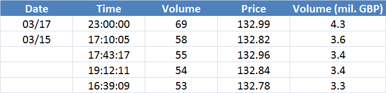 Největší obchody podle objemu na GBPUSD (aktivní future kontrakt): Největší denní objemy na trhu s měnovými futures. Na cenách, kde se včera objevily největší objemy, mohou být velcí hráči aktivní i dnes – zejména pokud se tyto ceny pohybují u některého ze včerejších high/low.