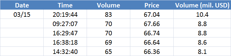 Největší obchody podle objemu na Brent (aktivní future kontrakt)