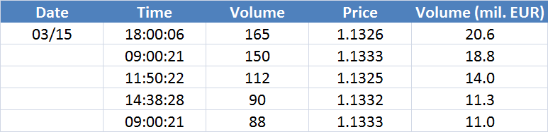 Největší obchody podle objemu na EURUSD (aktivní future kontrakt):