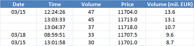 Největší obchody podle objemu na DAX (aktivní future kontrakt)