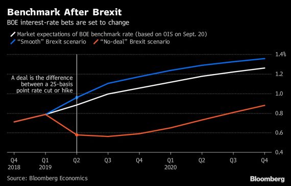 Očakávaný vývoj úrokových sadzieb pri rôznych scenároch BrExitu (@BloombergAsia)